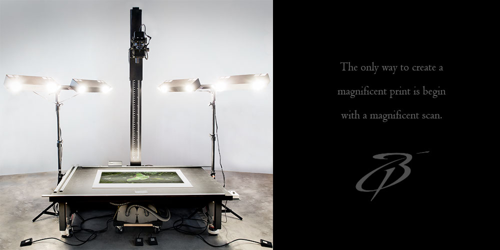 Our custom designed and built copy stand features a 40″ x 60″ delicate items vacuum table, which gently holds the original art in place for the duration of the image capture. The lighting, camera, lenses, Phase One IQ4 150mega pixel digital back, and processing software are all optimized to create a digital capture with exquisite detail and superior color accuracy. Our state-of-the-art system is a hybrid of document capture solutions in use in the finest museums and archives in the world, truly, there is no higher quality image and document capture available.